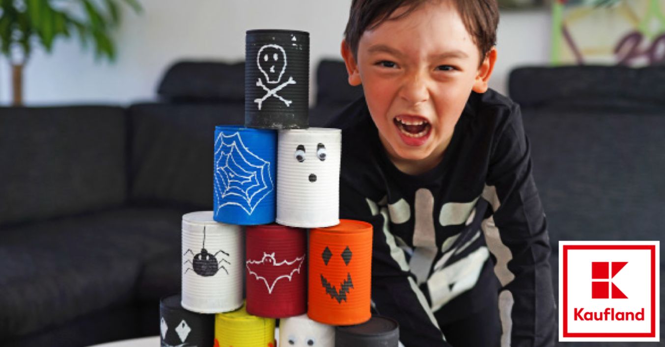 Un băiat îmbrăcat în costum de Halloween privește cu fața la cameră un turn de conserve pictate.
