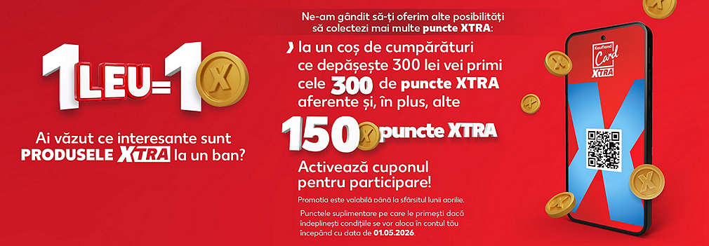 La un coș de cumpărături ce depăsește 300 de lei vei primi cele 300 de puncte XTRA aferente și, în plus, alte 150 de puncte XTRA. Activează cuponul pentru participare!