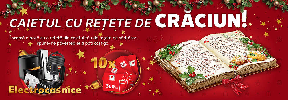 În spatele fiecărei rețete de sărbători se ascunde o poveste. Te invităm să deschizi ușa Crăciunului cu cea mai dragă poveste culinară! Împărtășește-ne rețeta ta preferată din caietul de rețete și povestea ei, și ai șansa de a câștiga electrocasnice de bucătărie sau un voucher de cumpărături Kaufland în valoare de 300 de lei.