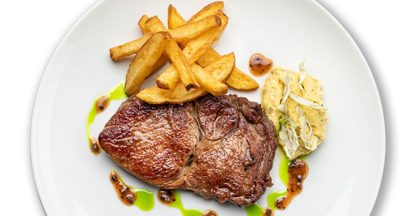 Pentru un gust de savoare în plus și pentru o culoare în farfurie, steakul de vită argentinian se servește alături de o porție de cartofi prăjiți, stropit cu pasta de trufe și un pahar de vin roșu.