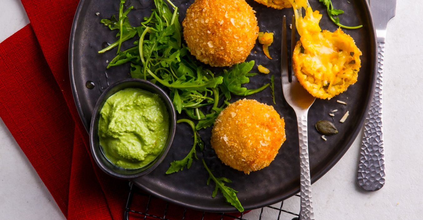 Se servesc câte 3 arancini calde cu sos pesto cu spanac și brânză feta, asezonate cu rucola, după gust.