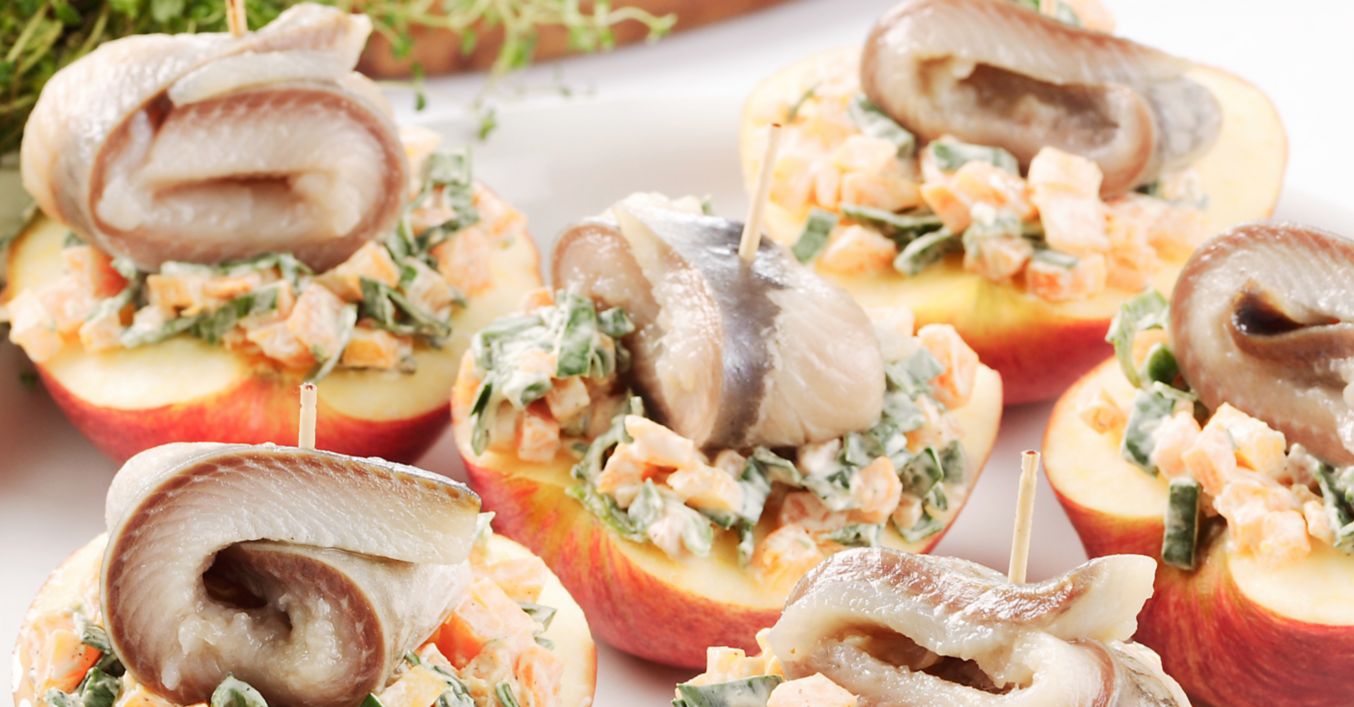 Se taie merele pe jumătate și li se scot semințele. Se pune câte o lingură de maioneză pe fiecare jumătate de măr. Deasupra se pune câte o bucată de hering și se fixează cu o scobitoare.