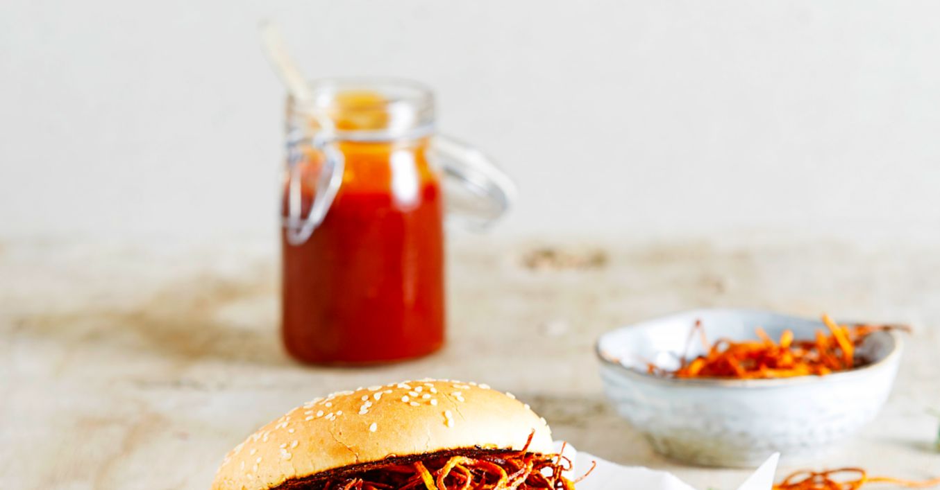 Condimentează burgerul cu sare și piper și stropește cu restul de sos Barbecue. Așază capacul și servește-l imediat.