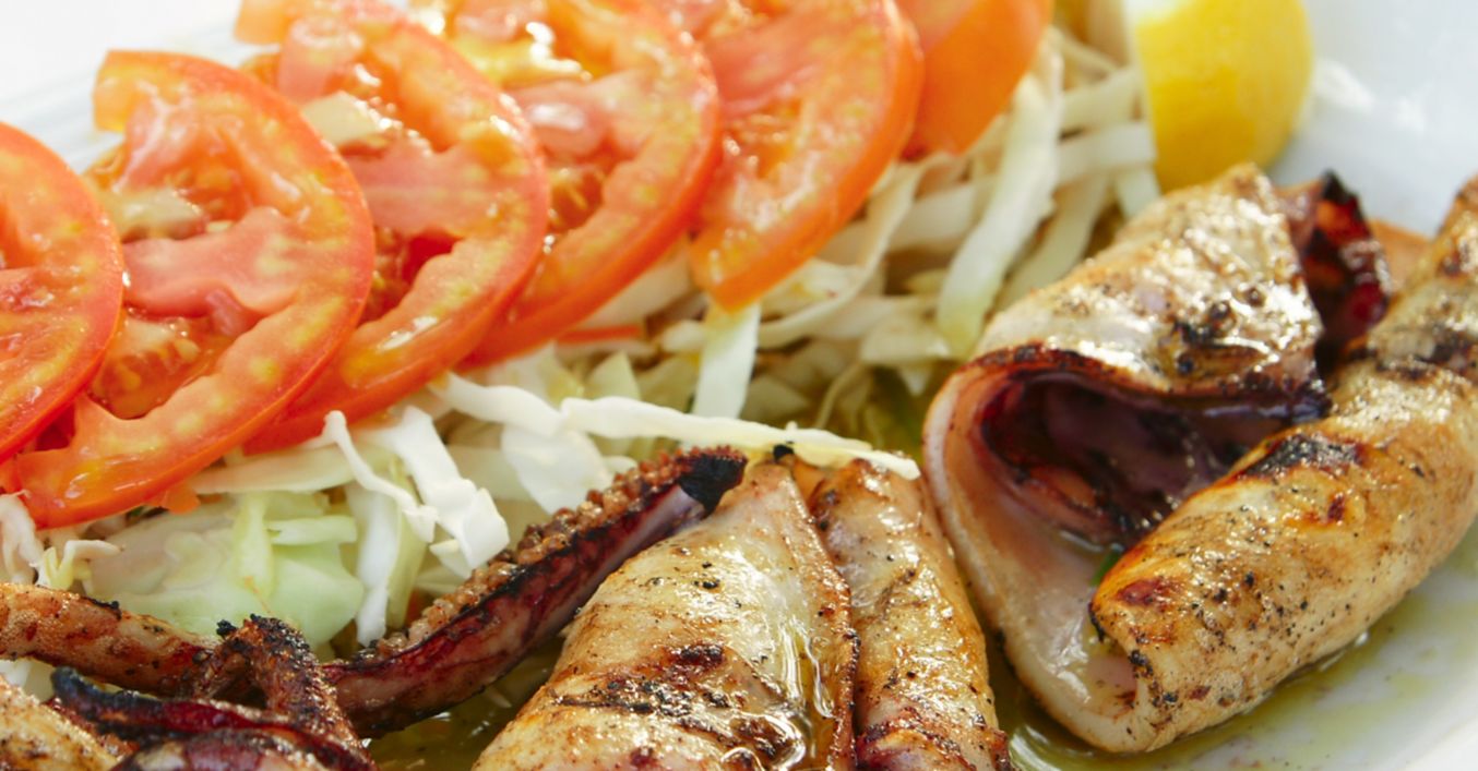 Se montează un platou. Se pun bucățile de caracatiță, salata de varză și se ornează cu rondele de roșie.