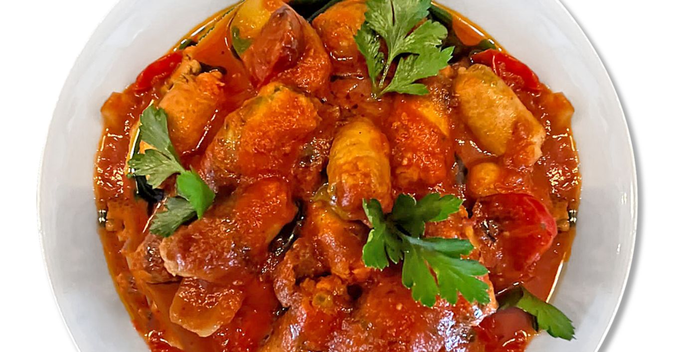 Separat, se toacă foarte mărunt ceapa verde, roșiile se spală, se decojesc și se taie în bucăți cât mai mici, iar la urmă se zbobesc cățeii de usturoi iar într-o tigaie adâncă în care s-a adăugat o lingură de ulei de măsline se pun la înăbușit legumele pentru aproximativ 10 minute. Se acoperă totul cu un capac iar după cele 10 minute, timp în care legumele au avut timp să evapore apa din ele, se adaugă sosul de roșii puțin câte puțin, amestecând continuu ca toată compoziția să capete consistența unui sos mai gros. Se asezonează cu sare, piper, cimbru și pătrunjel verde proaspăt.Înainte de a se servi acest fel de mâncare, pentru un gust de savoare, după ce cârnații, sosul roșu și legumele au fost gătite, toata compoziția se așează într-un vas de sticlă termoizolat și se lasă la cuptor la o temperatură de 180°C pentru câteva minute.
