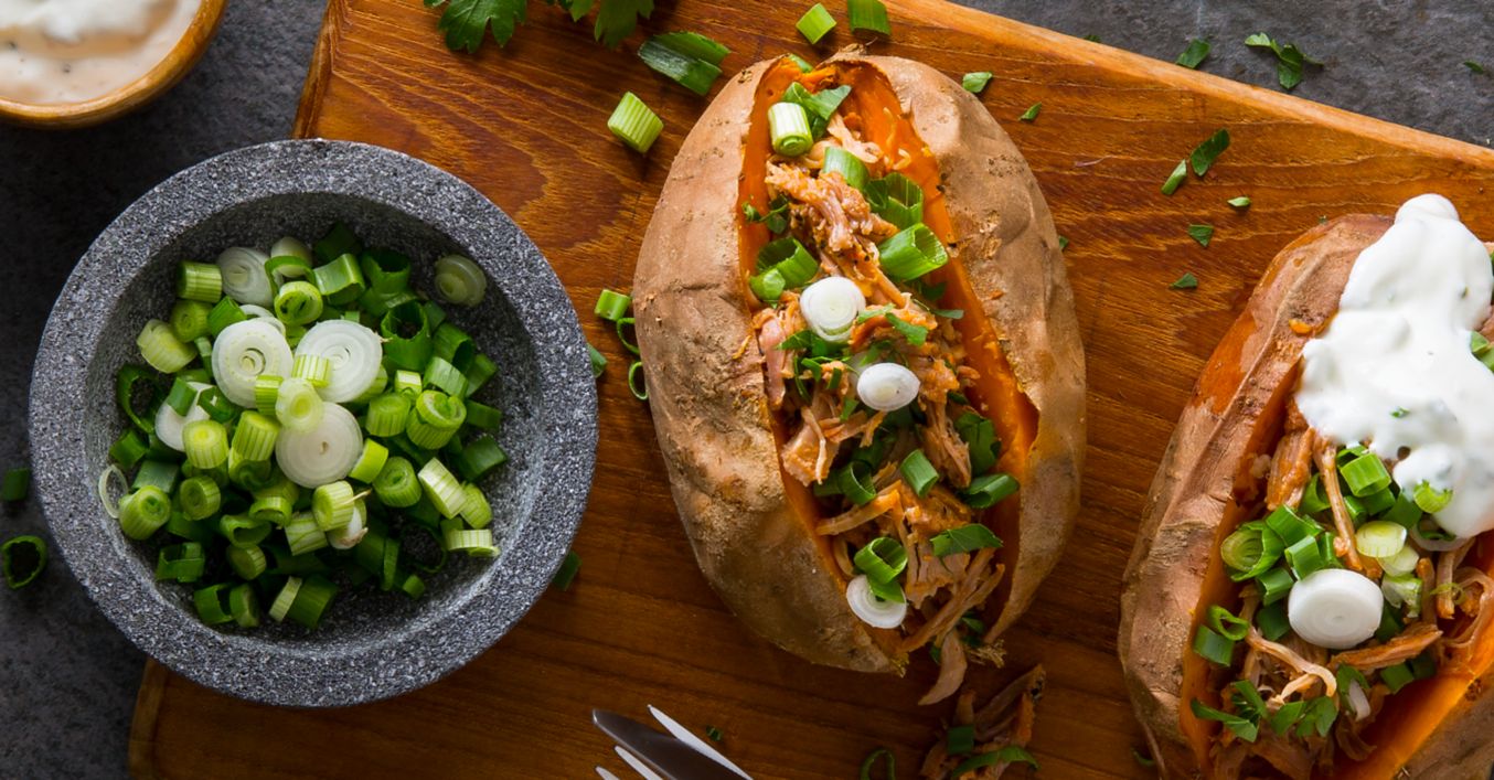 Cuptorul se încinge la 180 °C aer recirculat. Spală cartofii dulci, împachetează fiecare cartof în folie de aluminiu și pune la copt aproximativ 50 de minute.