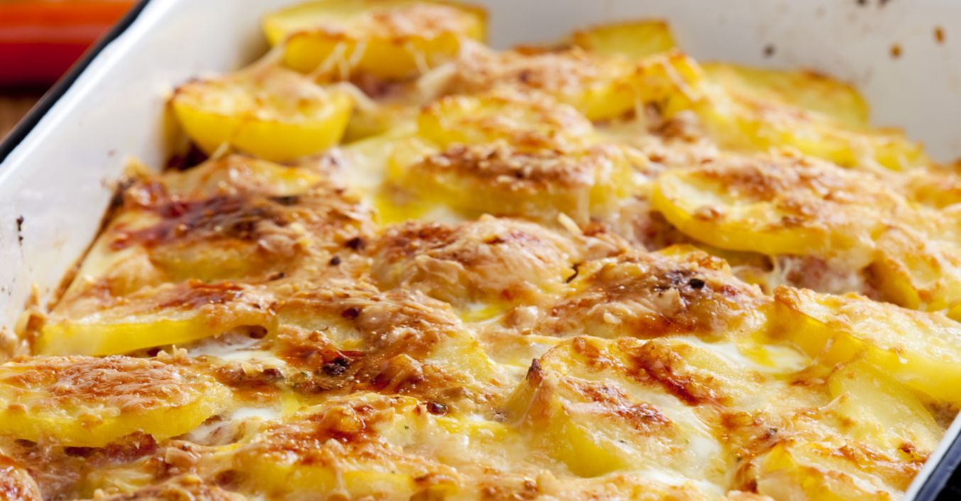 Se curăță cartofii și se taie rondele. Se unge o tavă întinsă cu unt. Se pune un strat de cartofi, se întinde umplutura și se acoperă cu încă un strat de cartofi. Se pun cubulețe de unt, din loc în loc. Se presară restul de cașcaval ras și se coc 45 minute în cuptor, la foc moderat.