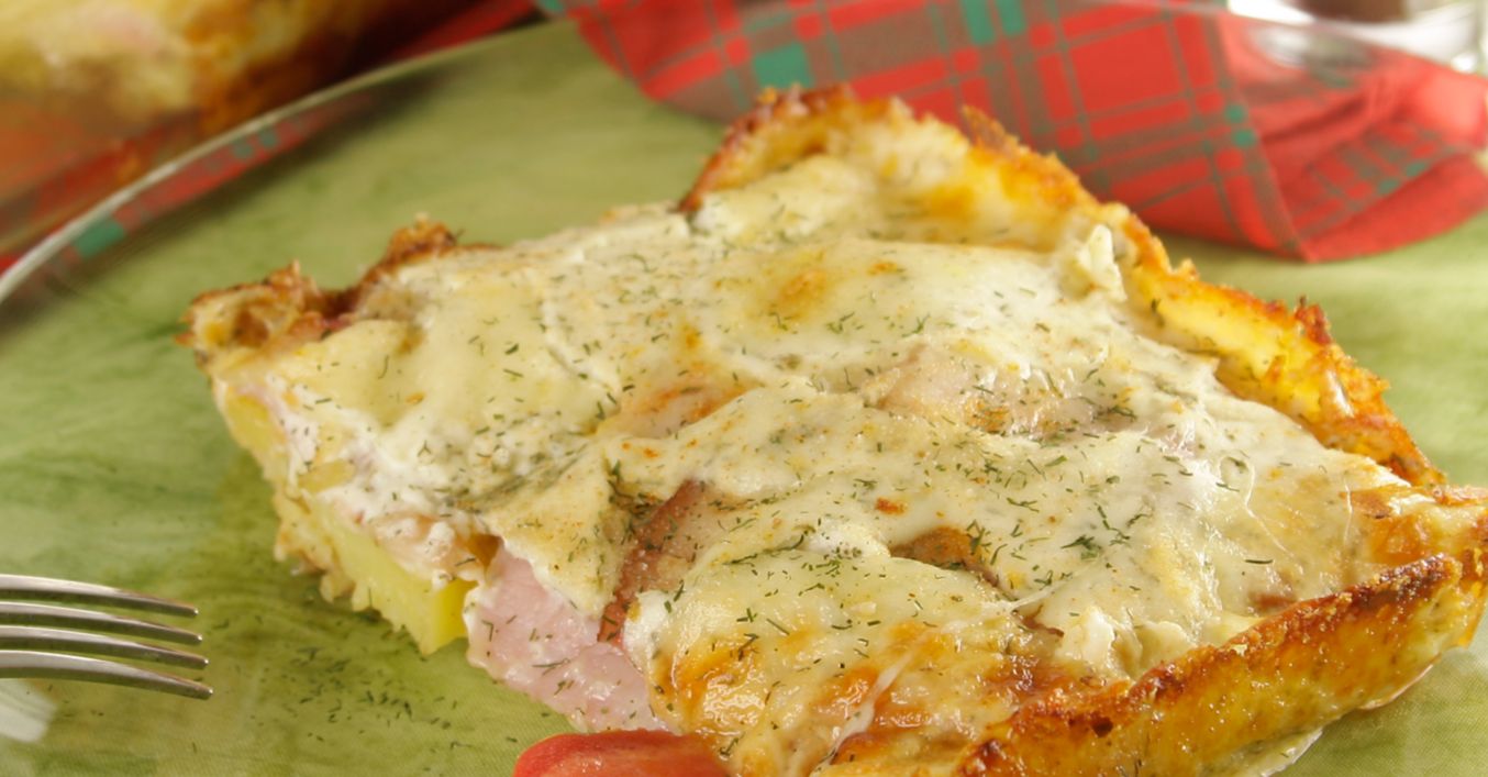 Ungi o tavă cu ulei. Așezi în straturi feliile de cartofi, cașcavalul și jambonul, având grijă să stropești cu smântână fiecare strat de cartofi.