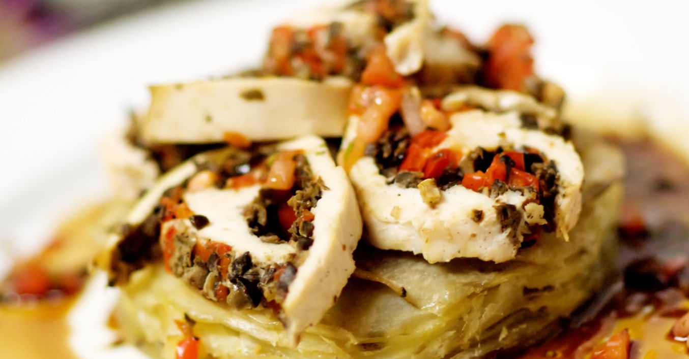 Se bate bine pieptul de pui. Se întinde umplutura preparată anterior pe toată suprafața pieptului. Se rulează, se leagă cu ață alimentară și se prăjește în ulei bine încins, până se rumenește uniform. Se taie felii.