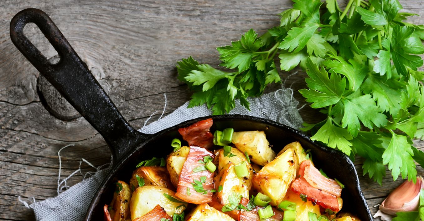 Se pregătește o tavă termorezistentă, se pun cartofii tăiați cubulețe, baconul împreună cu legumele pregătite la tigaie plus sosul din tigaie, se amestecă ușor astfel încât să nu se sfărâme cartofii și se bagă la cuptor, la 180 °C, timp de 5-10 minute sau până se rumenesc cartofii.