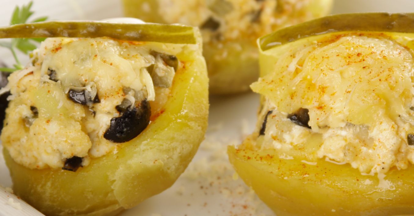Speli cartofii și îi fierbi 20 de minute, fără să-i decojești, în apă cu sare, timp de 20 de minute. Îi scurgi, iar după ce s-au mai răcit, îi cureți și îi tai în jumătate, pe lungime. Cu ajutorul unei lingurițe, îndepărtezi miezul cartofilor, păstrându-le pereții groși de 1 cm.