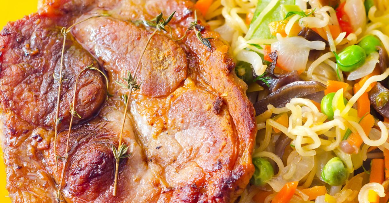 Se montează farfuriile aranjându-se o bucată de ceafă și garnitură de legume.