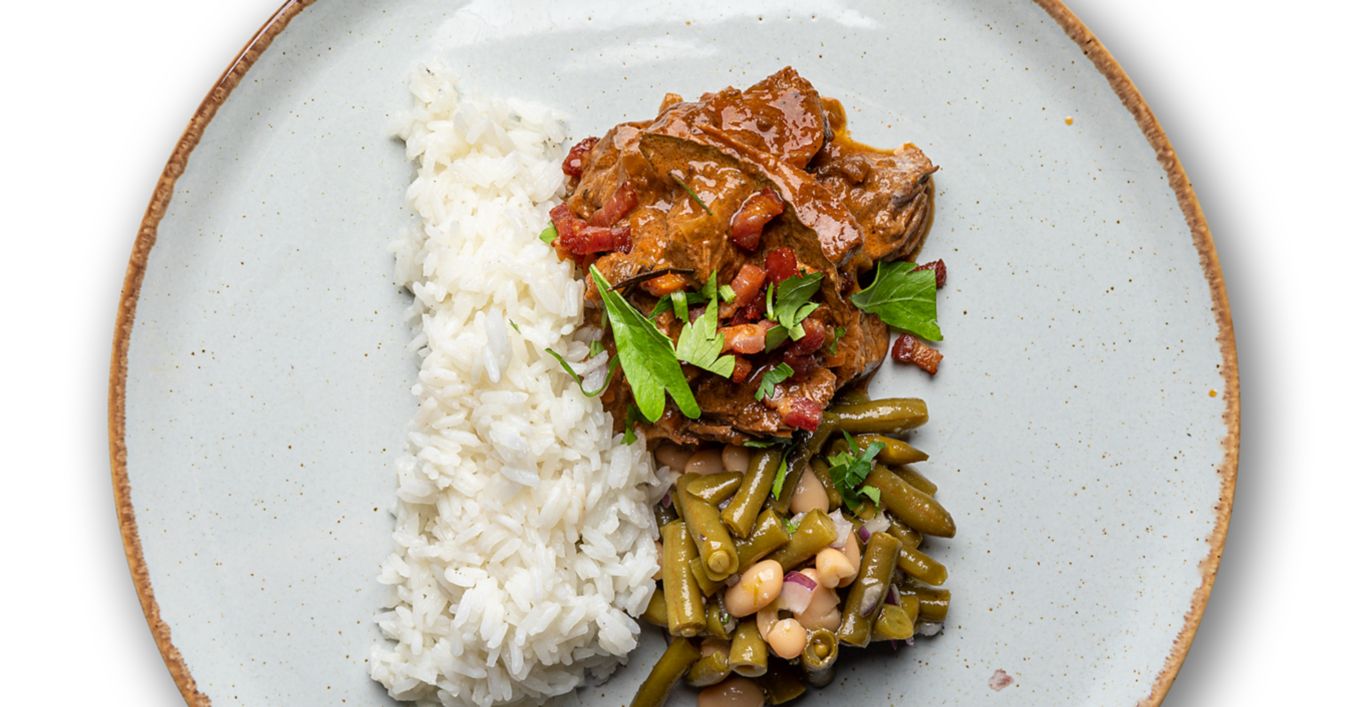 Pe o farfurie întinsă, se pune carnea alături de garnitura de orez langă care se adaugă fasolea verde împreună cu boabele de fasole albă peste care se presaraă frunze de pătrunjel verde.