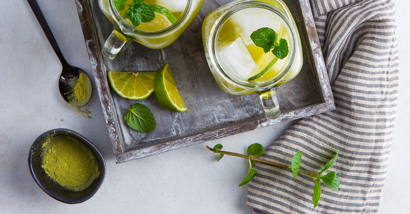 Scoate menta și toarnă amestecul într-o carafă umplută pe un sfert cu cuburi de gheață. Amestecă pudra de ceai verde cu ceaiul de mentă și lasă-l la frigider cel puțin 1 oră.