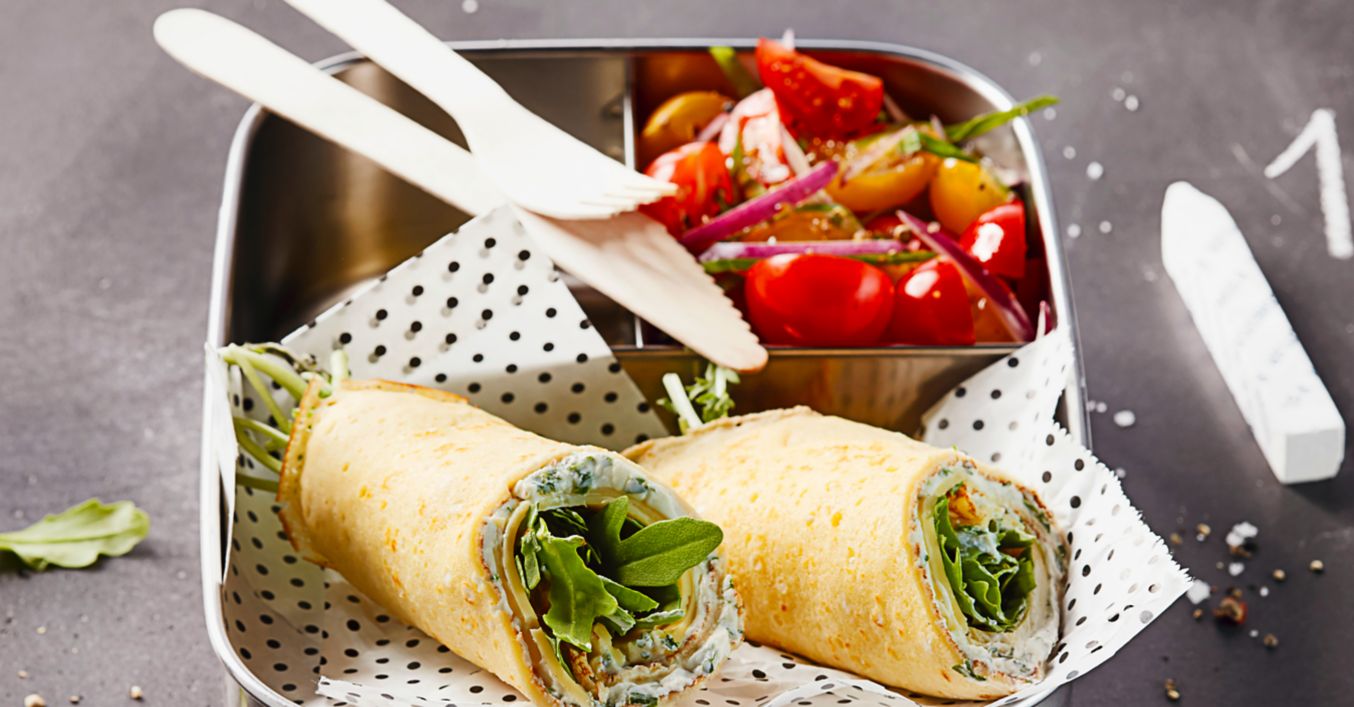Clătitele se ung cu brânza proaspătă și se așază pe acestea felii de brânză Gouda. Frunzele de rucola se distribuie pe acestea și se rulează strâns clătitele.