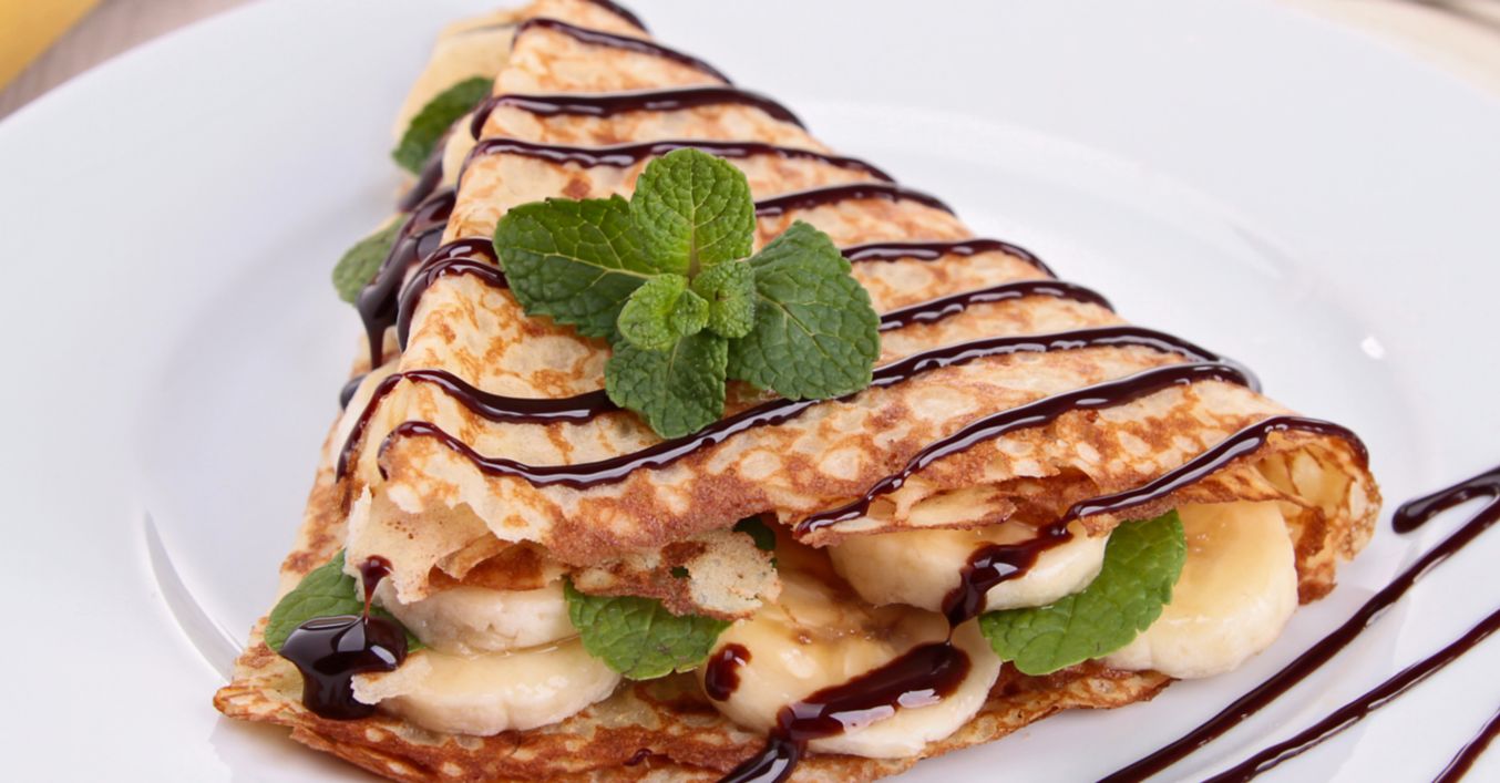 Se umplu cu rondele de banană, se pliază și se ornează cu sirop de ciocolată.