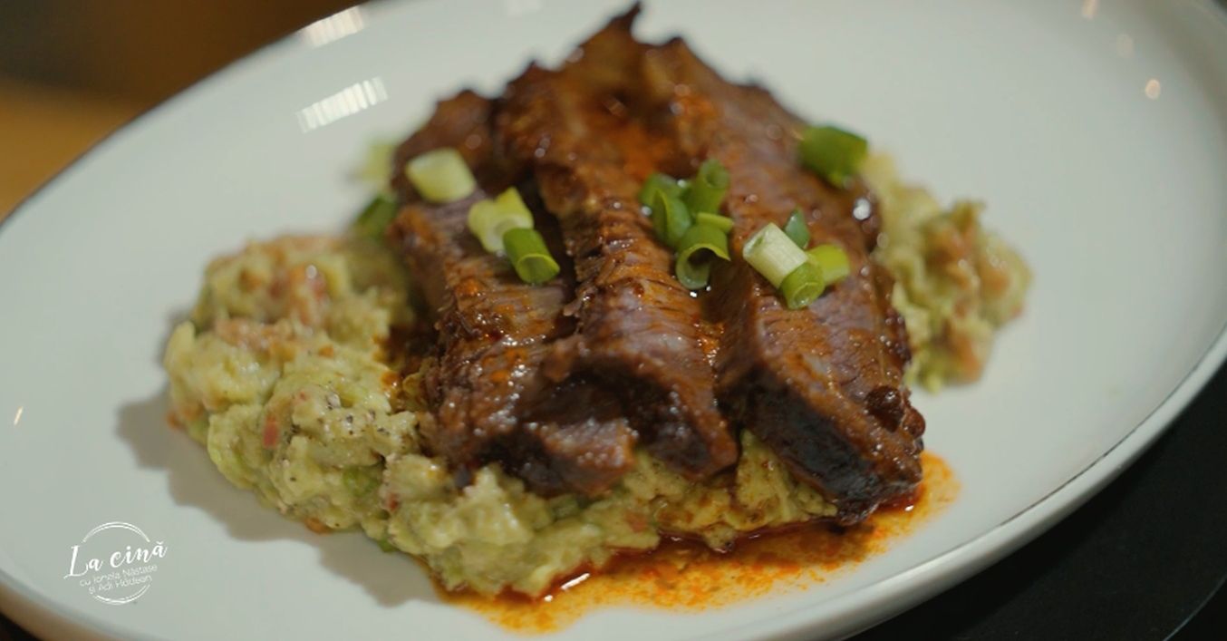 Așezăm feliuțele de carne lângă garnitura de guacamole și ne bucurăm de aromele rezultate!