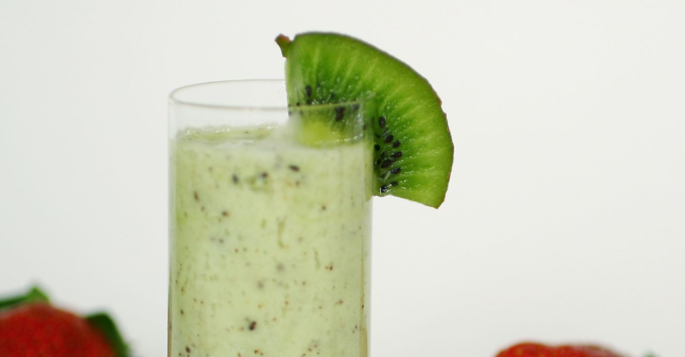 Se toarnă în pahare și se ornează cu bucăți de kiwi.