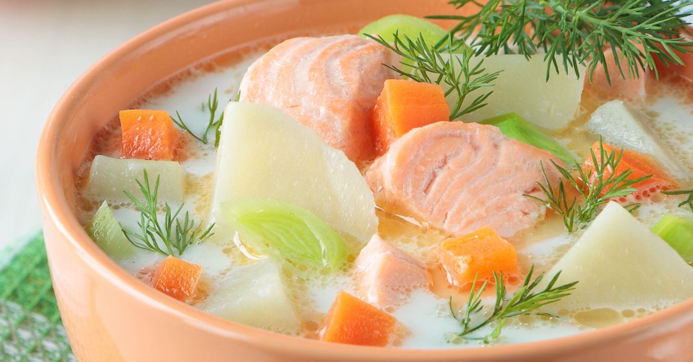 Se curăță legumele și se taie după preferință. Se pun la fiert în 2 litri de apă. Când sunt fierte se adaugă somonul tăiat bucățele mici și se fierb încă 10 minute.