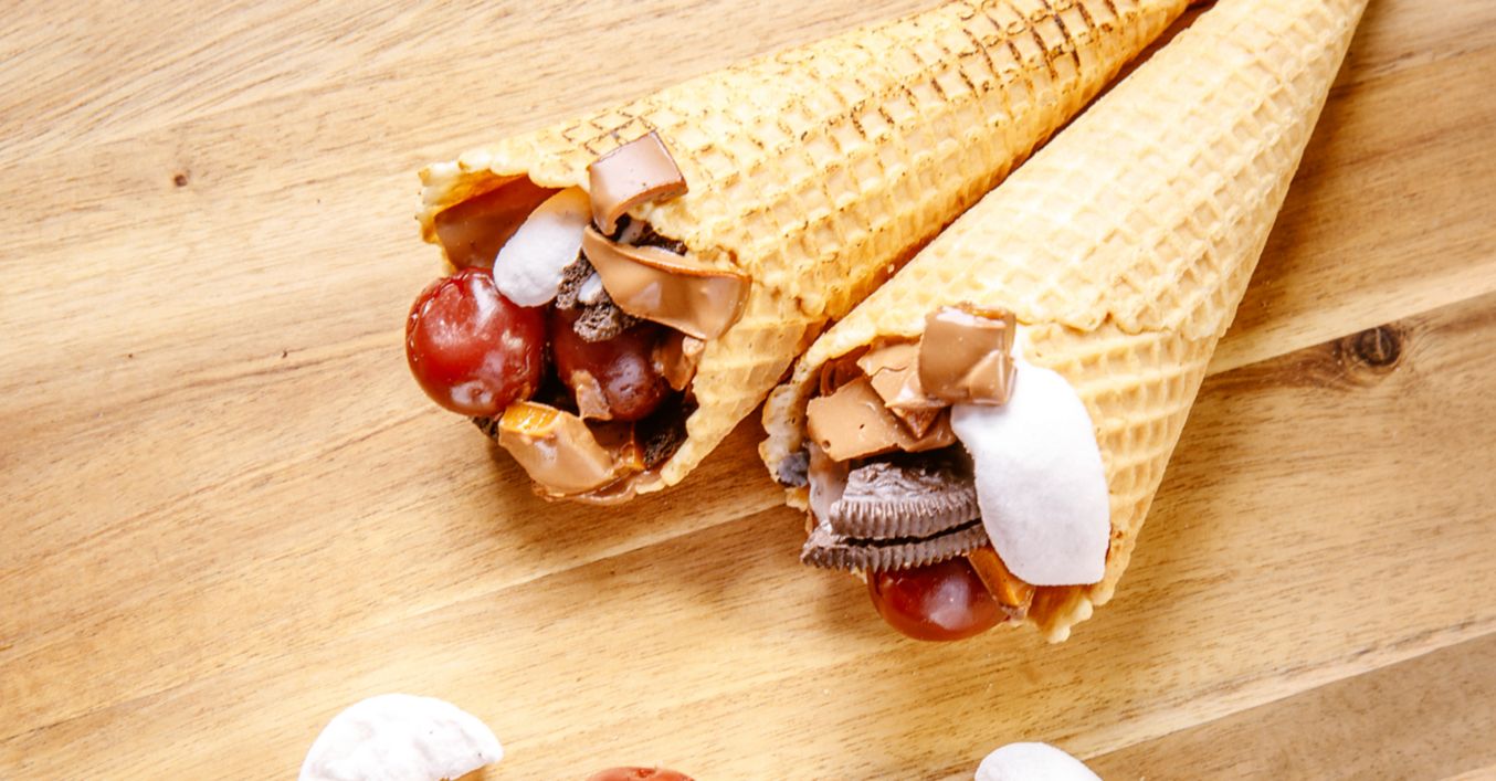 Cornetele de înghețată se umplu cu bezele, biscuiți, praline și cireșe, iar apoi sunt rulate în folie de aluminiu și se lasă pe grătar, la foc mediu aprox. 5-8 minute.