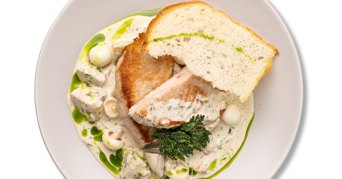 Cotlet de porc cu sos de ciuperci și ulei de ceapă verde