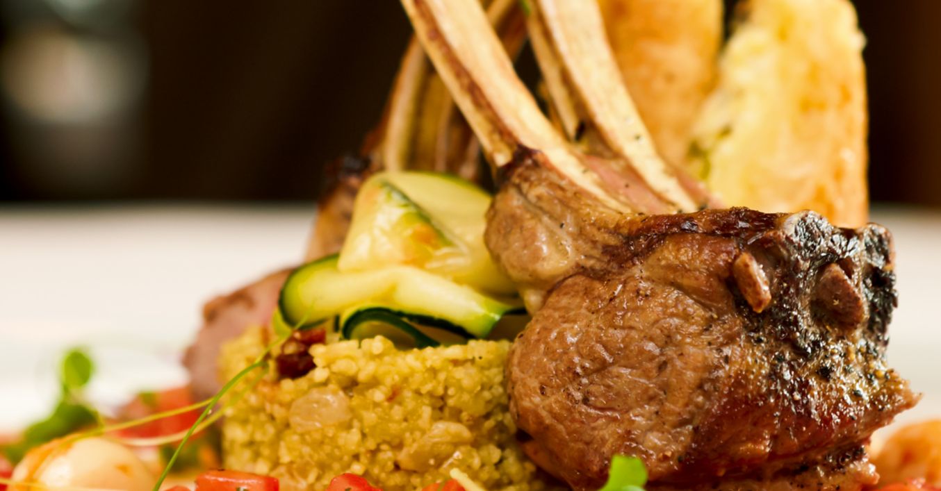 Se montează farfuriile. Se pune o porție de cuș-cuș pe care se așează felii de castravete, se adaugă cotletele de berbecuț și se ornează farfuria cu roșii tăiate, presărate cu sare.