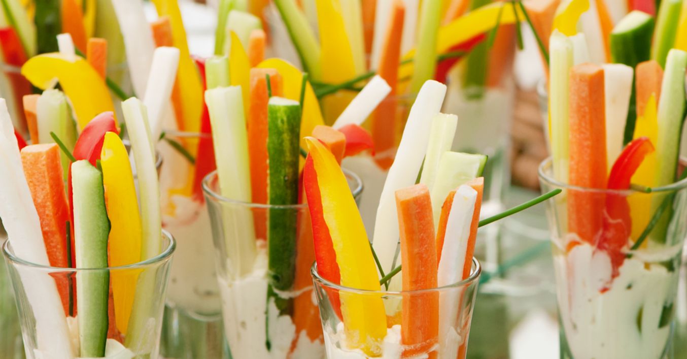 Se curăță legumele și se taie bastonașe. Se înfig în crema din pahare, într-un mod cât mai variat. Se adaugă frunze de ceapă verde.