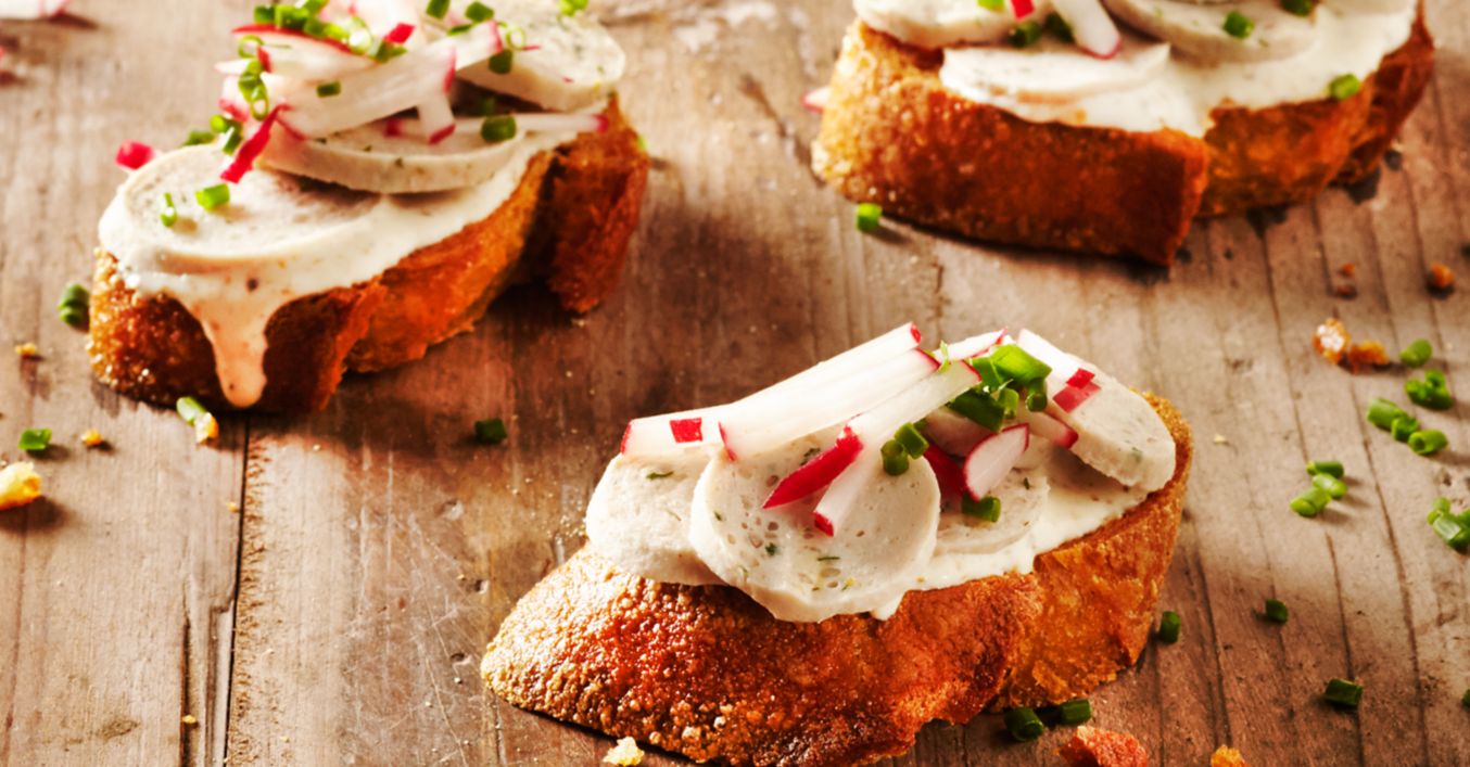 Ridichile marinate se pun pe feliile de cârnați și deasupra se presară restul de chives.