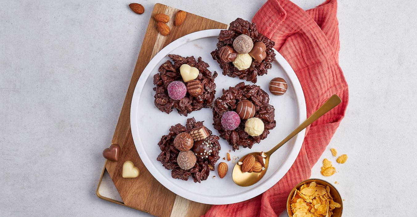 Cu două linguri, formați 6 cuiburi de ciocolată pe o tavă de copt tapetată cu hârtie de copt și lăsați-le să se întărească.