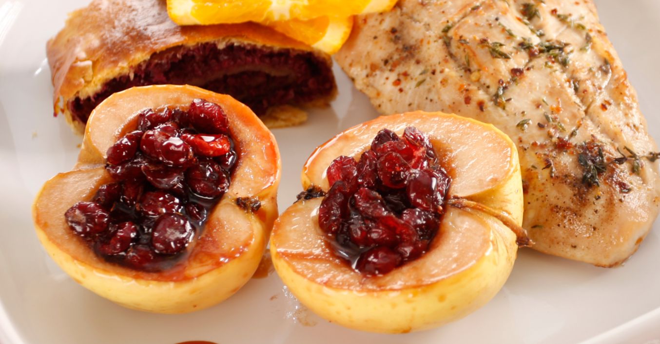 Pentru garnitura cu mere, caramelizezi zahărul, stingi cu vinul sec și lași să scadă la foc mic. Adaugi fructele deshidratate și vinul dulce, iei vasul de pe foc și lași să se pătrundă. Tai merele în jumătate, pe lungime și le îndepărtezi caseta cu semințe. Le înăbuși împreună cu sucul de mere și untul. Le umpli cu fructele rehidratate.