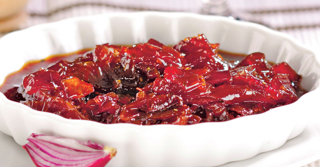 Când ceapa este sticloasă, stingi cu vinul negru, adaugi restul de zahăr, oțetul balsamic, condimentele și fierbi până se leagă siropul, la foc moderat, cam 30-45 de minute.