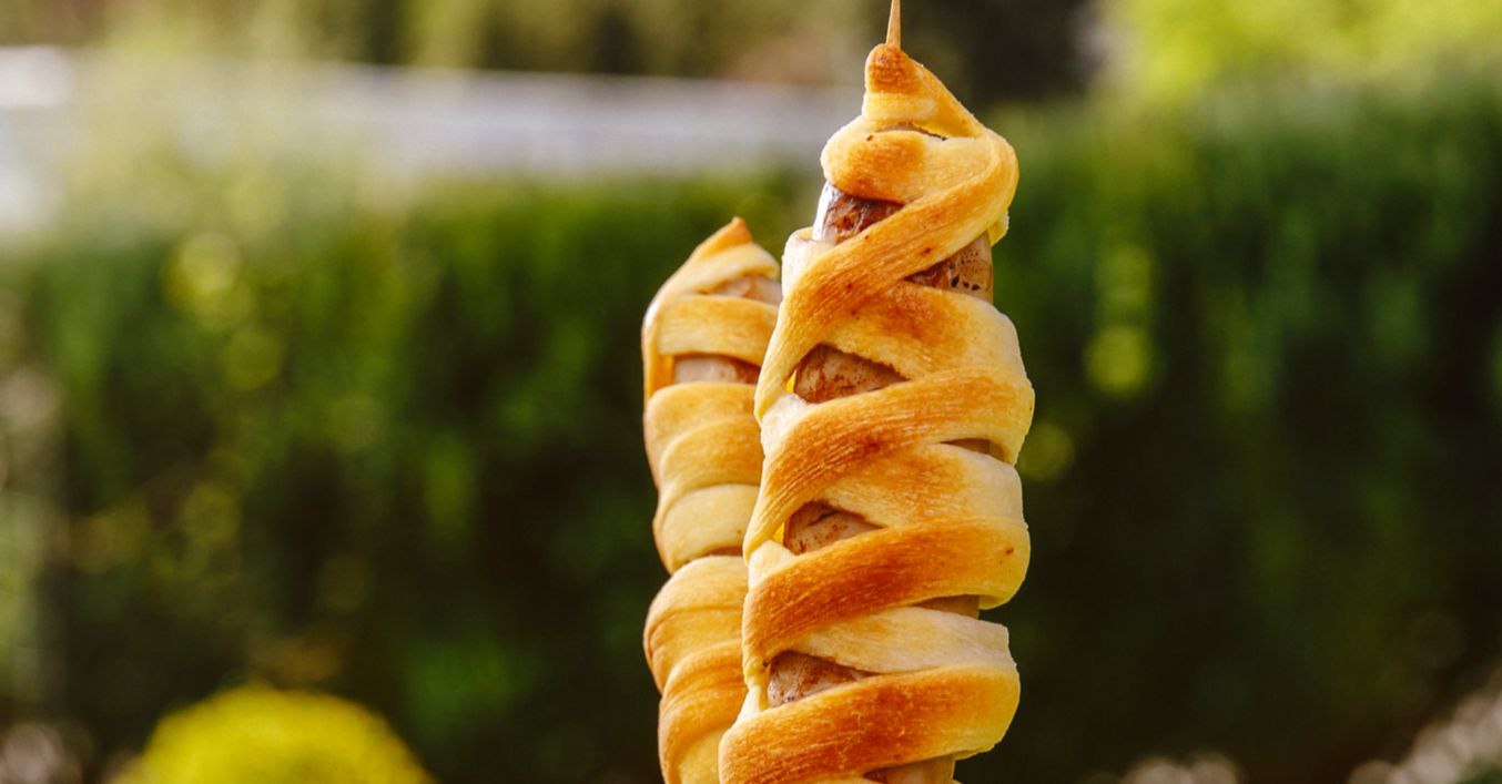 Aluatul de pizza se taie în fâșii cu grosimea de 1 cm și lungimea de 20 cm. Cârnații de grătar se înfășoară cu cât o fâșie de aluat și se înfig pe câte 1 frigăruie.