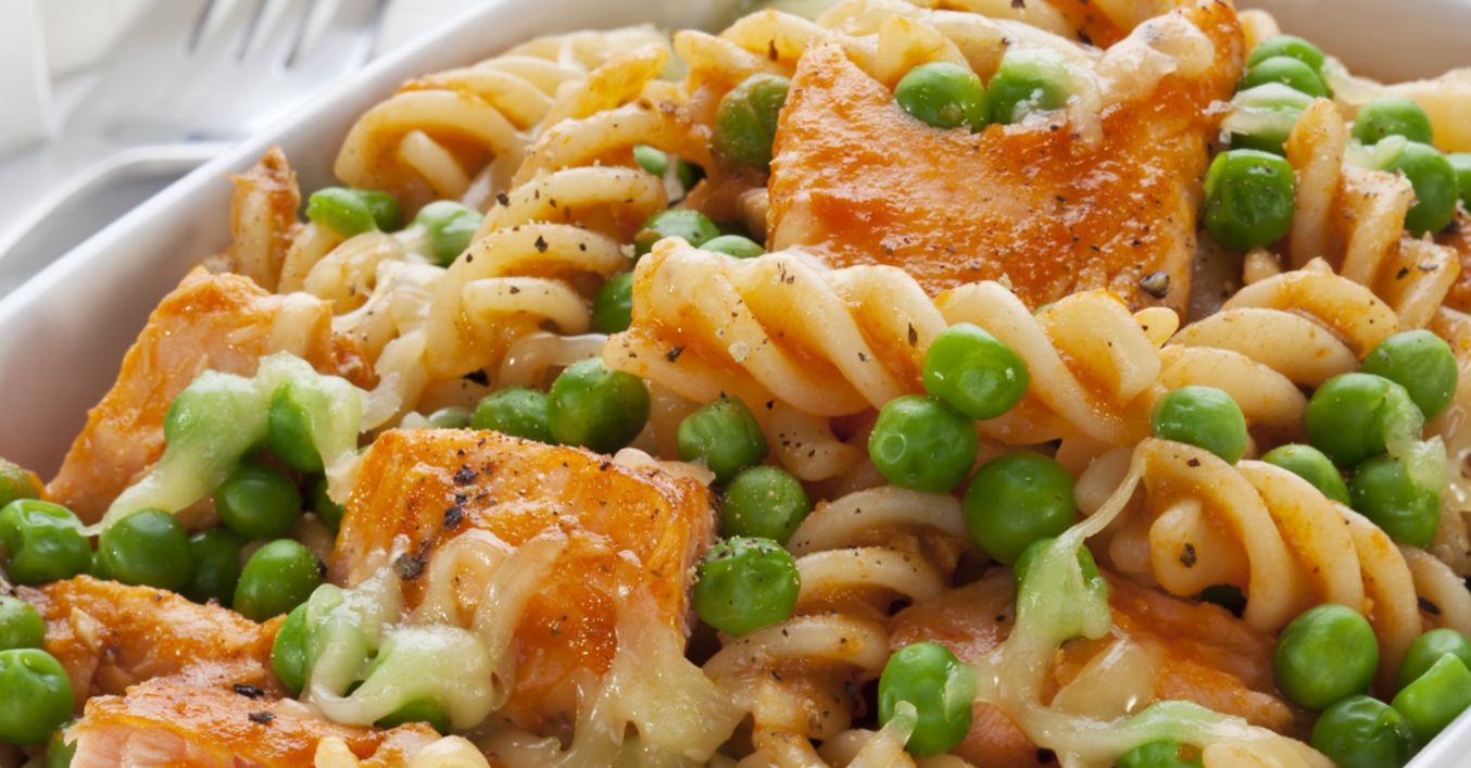 Se pun pastele într-o tavă unsă cu unt. Se adaugă mazărea și somonul desfăcut bucățele. Se presară piper și se adaugă cașcavalul ras.