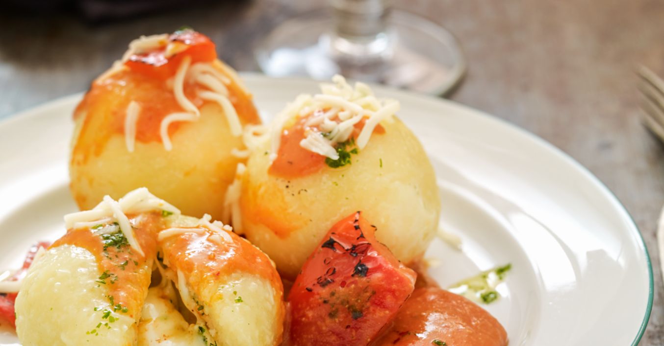 Bucățile de ardei se adaugă în sos, se așază în farfurii împreună cu găluștele, se stropesc cu uleiul cu ierburi aromatice, se presară pe deasupra mozzarella și se servește.