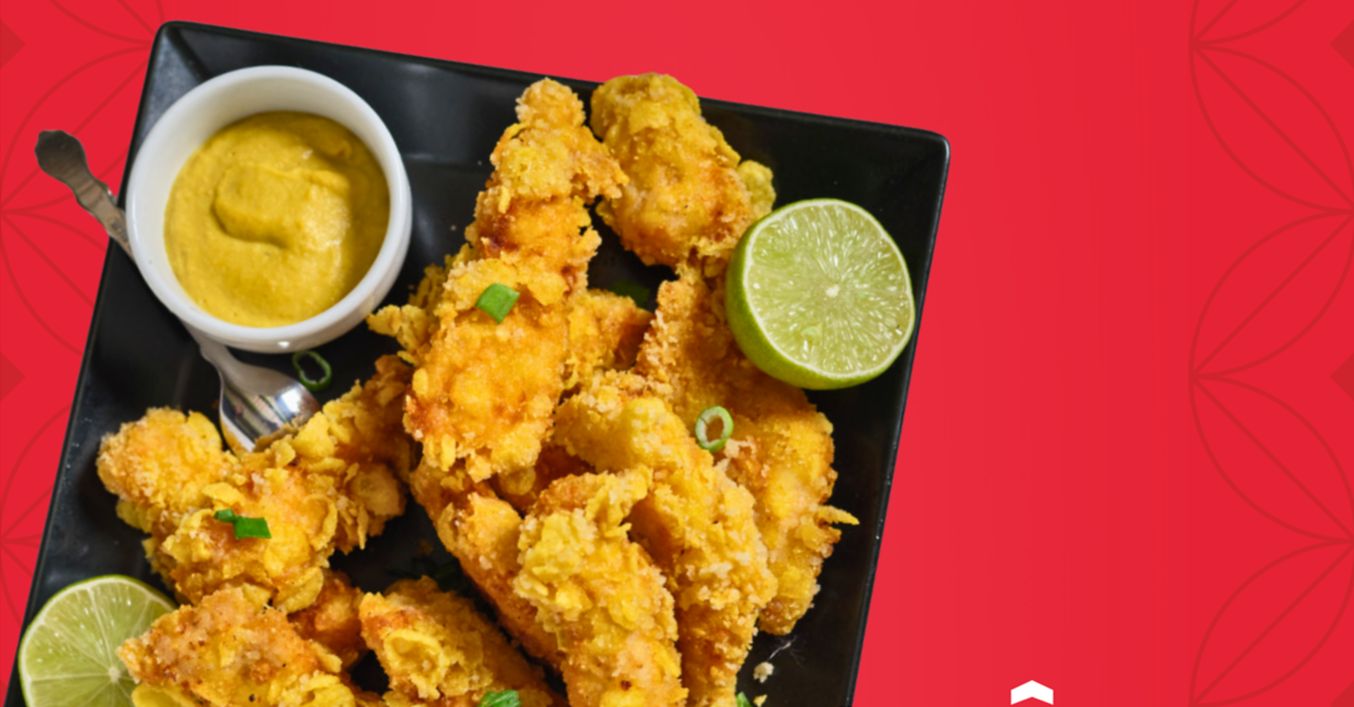 Fășiile de pui se trec prin faină,amestecul de ou,apoi prin Panko amestecat cu fulgi de porumb
