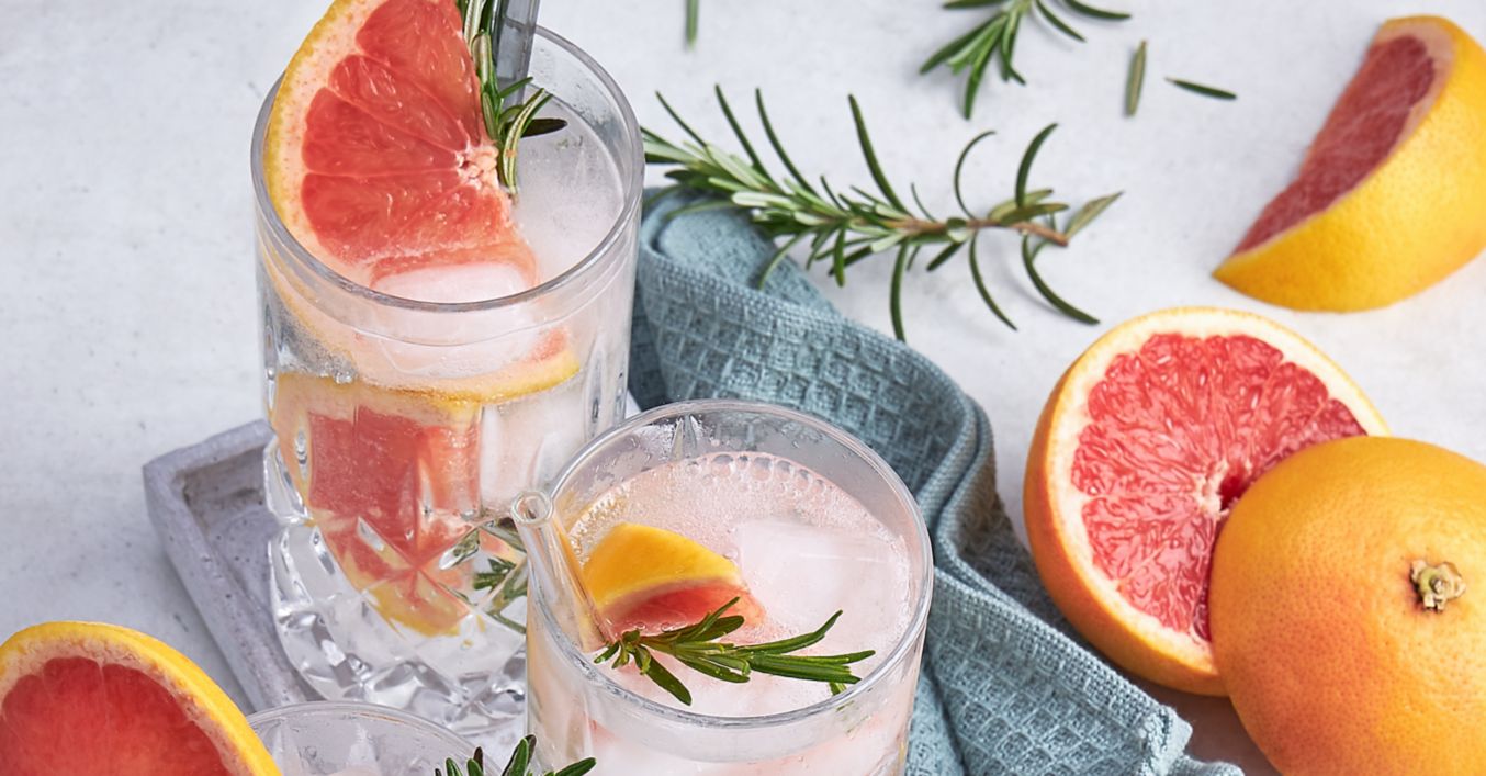 Adaugă feli de grapefruit, cuburi de gheață și votcă în două pahare, umple cu apă minerală și servește împreună cu crenguțe de rozmarin.