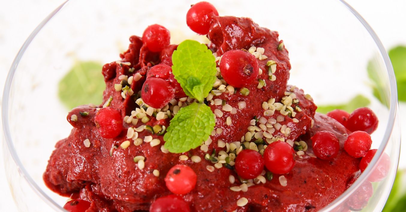 Se așază înghețata într-o cupă de servit și se decorează cu coacăze roșii, semințe de cânepă și mentă proaspătă.