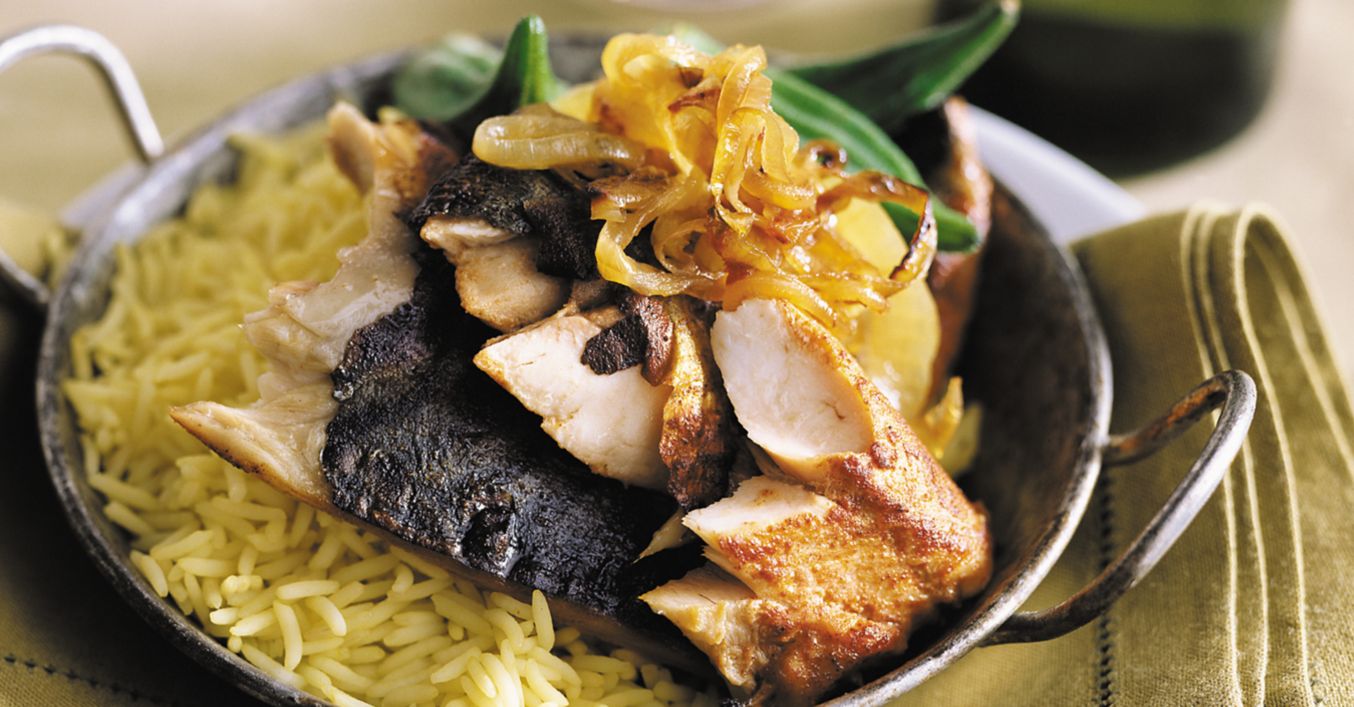 Între timp, se încălzește în prealabil cuptorul la 230°C. Se stropește macroul cu 2 lingurițe de ulei și se coace 12 minute sau până când peștele este făcut. Se servește cu amestecul de ceapă caramelizată deasupra.
