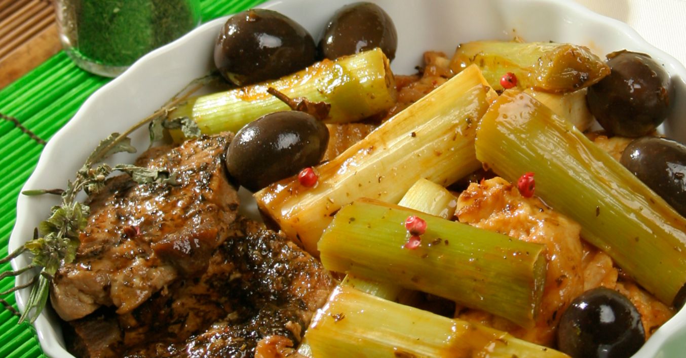 Când carnea s-a înmuiat, adaugi în cratiță prazul, măslinele și puțină apă fierbinte. După 5 minute, torni făina și bulionul dizolvate în vinul rece și completezi cu apă cât să acopere ingredientele.