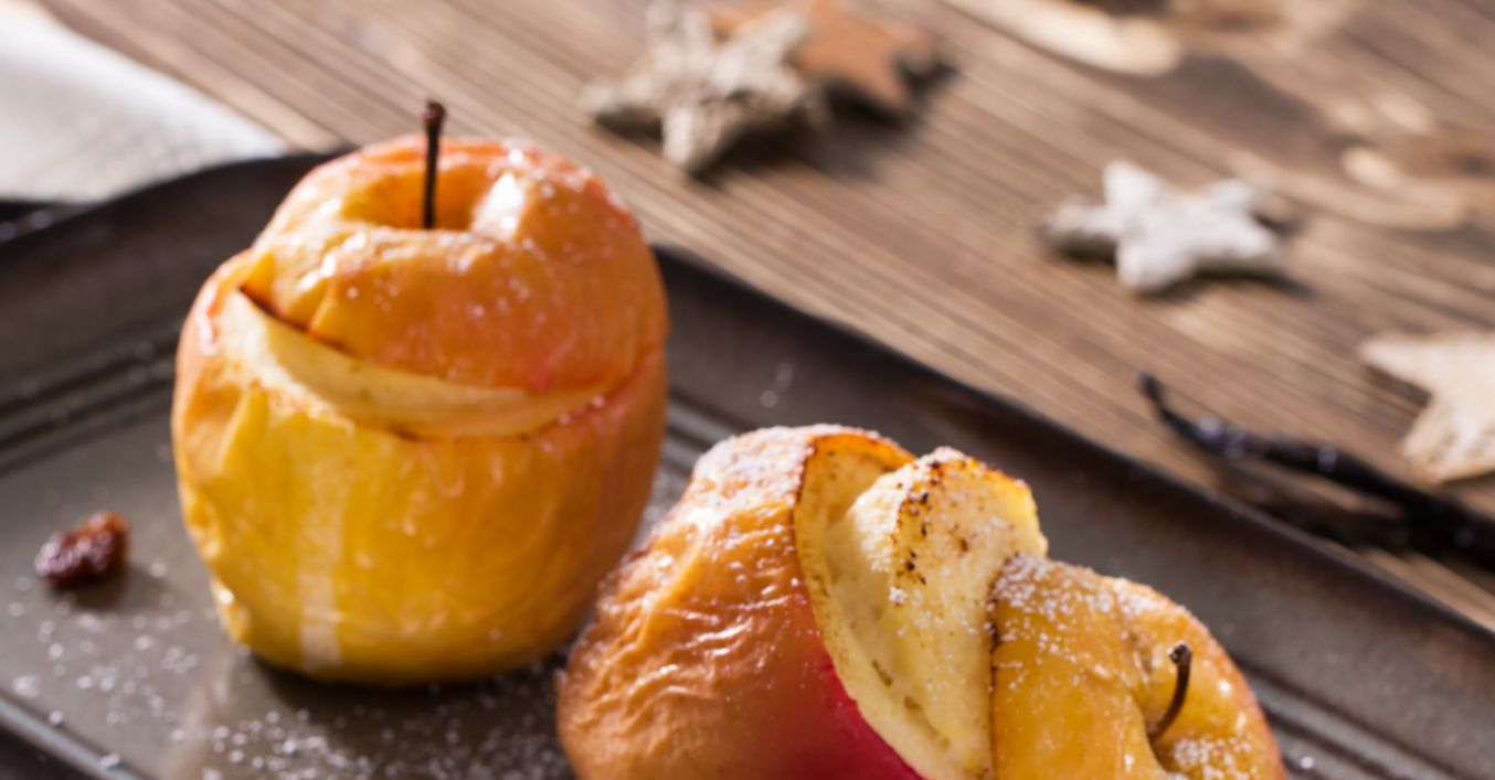 Pune capacul la loc, unge merele cu unt topit și gatește-le în cuptorul preîncălzit la 180 de grade cu aer circulant (200 de grade sus/jos) timp de 30-35 de minute.