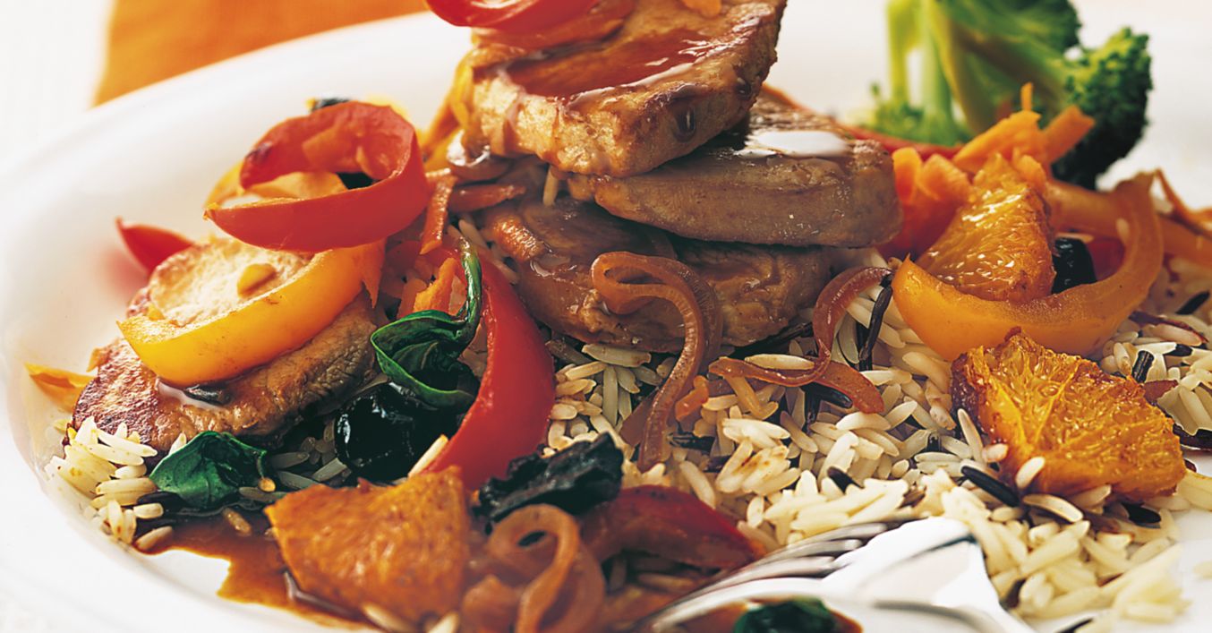 Pentru a servi mâncarea, se împarte orezul în 4 farfurii calde, iar medalioanele de porc și legumele se așază deasupra. Se stropește totul cu sosul rămas în tigaie și se servește imediat.