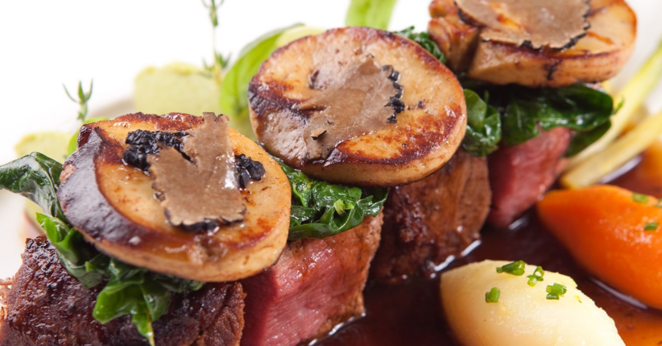 Se montează platoul. Se pune mușchiul de vită, se presară cu pătrunjel verde tocat și se adaugă bucăți de brânză. Se pun legumele sotate și se presară totul cu sare și piper.