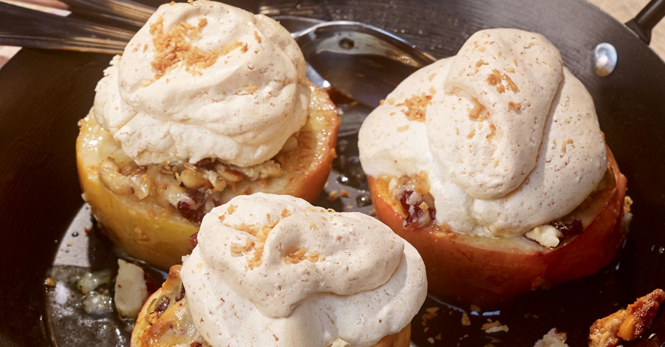 Se umple merele cu amestecul de marțipan, după care merele se coc în cuptorul preîncălzit la 180 de grade (convecție: 180 de grade) între 30 și 35 de minute. După aprox. 10 minute de copt, distribuie masa de spumă cu cocos cu o lingură pe mere și așteaptă până când merele sunt gata.