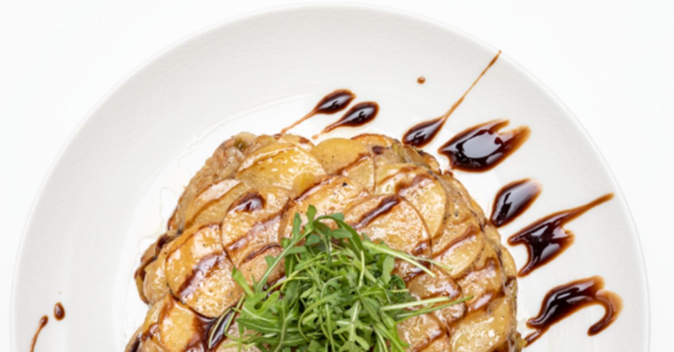 Din acest moment se trece la aranjarea preparatului și anume: într-o tavă căptușită cu hârtie de copt se așează un strat de carne, apoi un strat de legume, după care un strat de cartofi până când se fac patru straturi. Pentru o bună susținere, se pot folosi bețe pentru frigărui pentru a le ține împreună. La final, se presară ouăle amestecate cu parmezan, iar toată compoziția rezultată se lasă la cuptorul încins la o temperatură de aproximativ de 190°C timp de 9 minute.