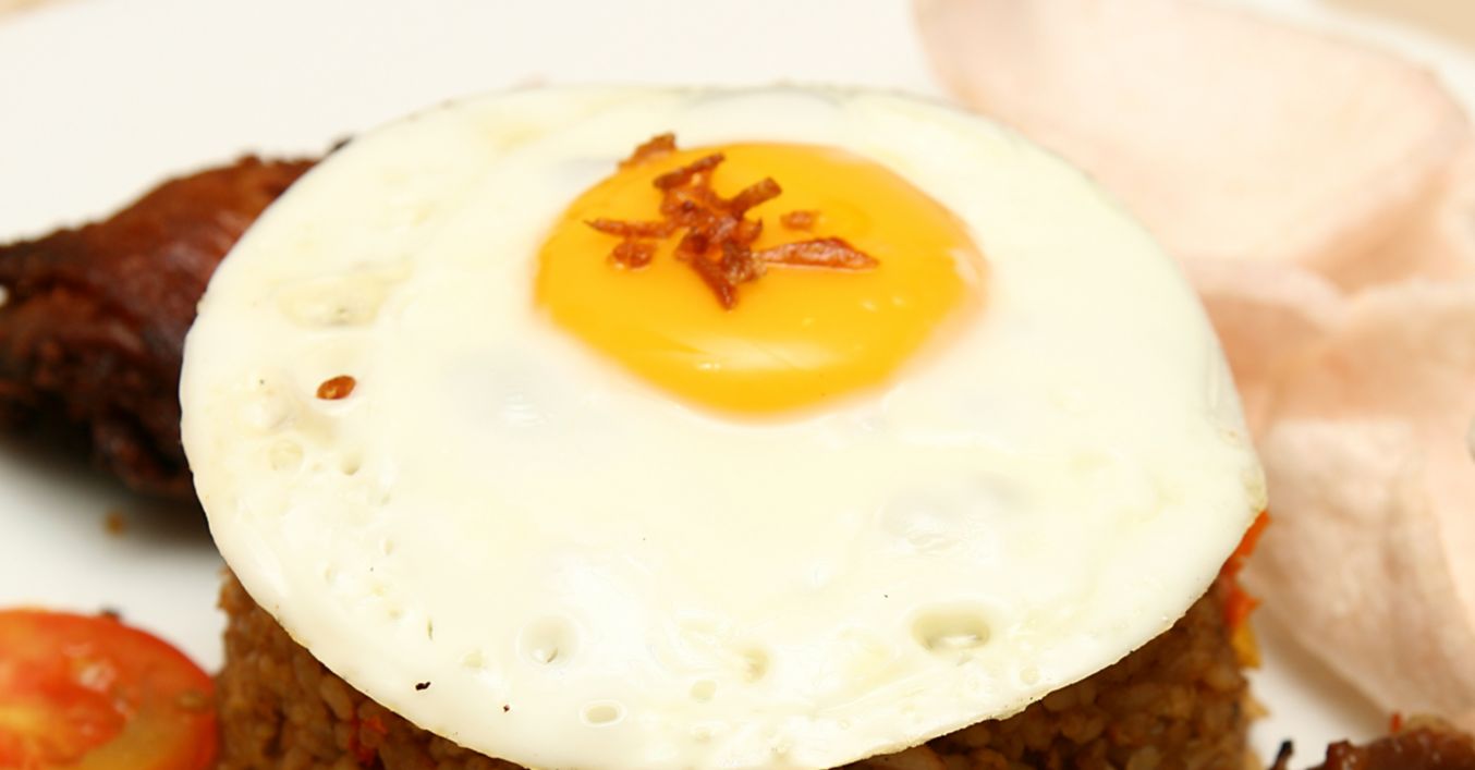 Se montează farfuriile. Se răstoarnă câte un bol de orez, peste care se pune un ou ochi, se adaugă 2 frigărui și se ornează cu rondele de castravete și roșie.
