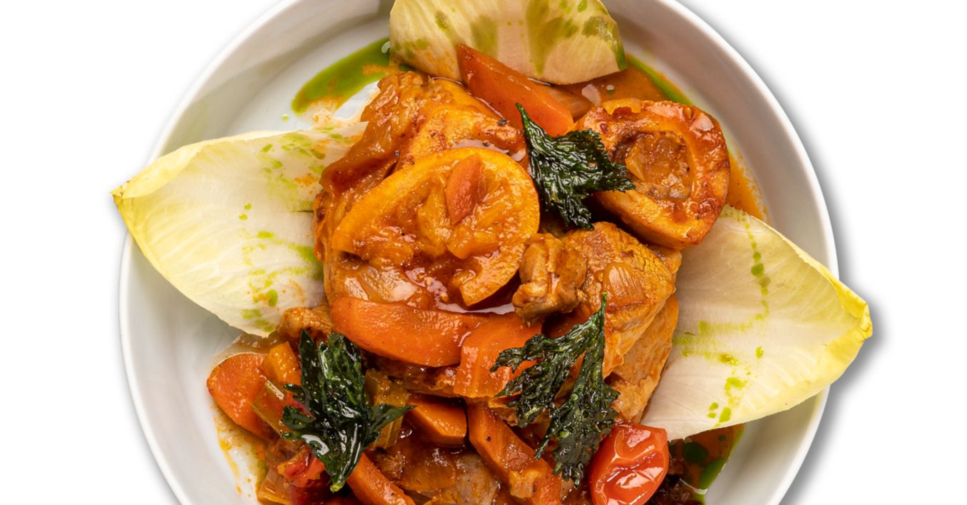 Osso bucco în sos de portocale morcovi si andive
