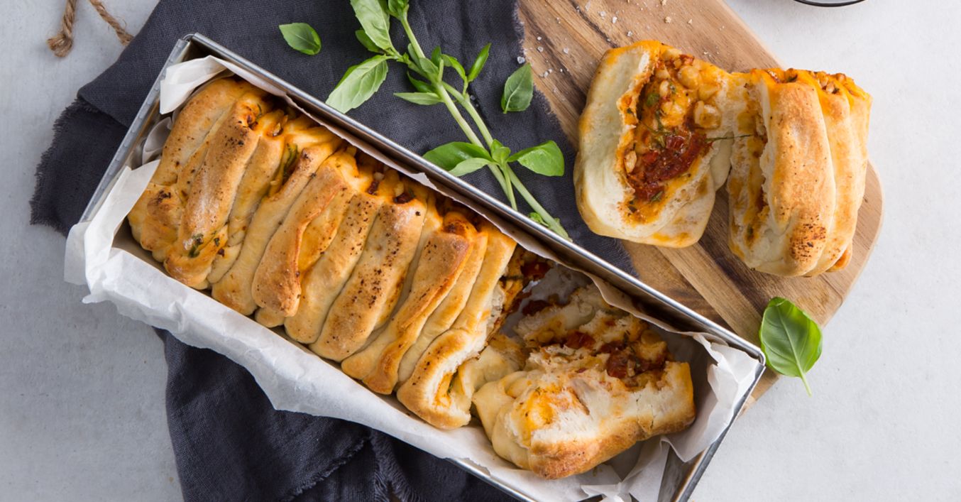 Aluaturile de pizza se derulează unul lângă celălalt, se ung cu pesto și se așază deasupra roșii uscate, usturoi, alunele caju și busuiocul. Aluaturile se pliază și se etanșează marginile.