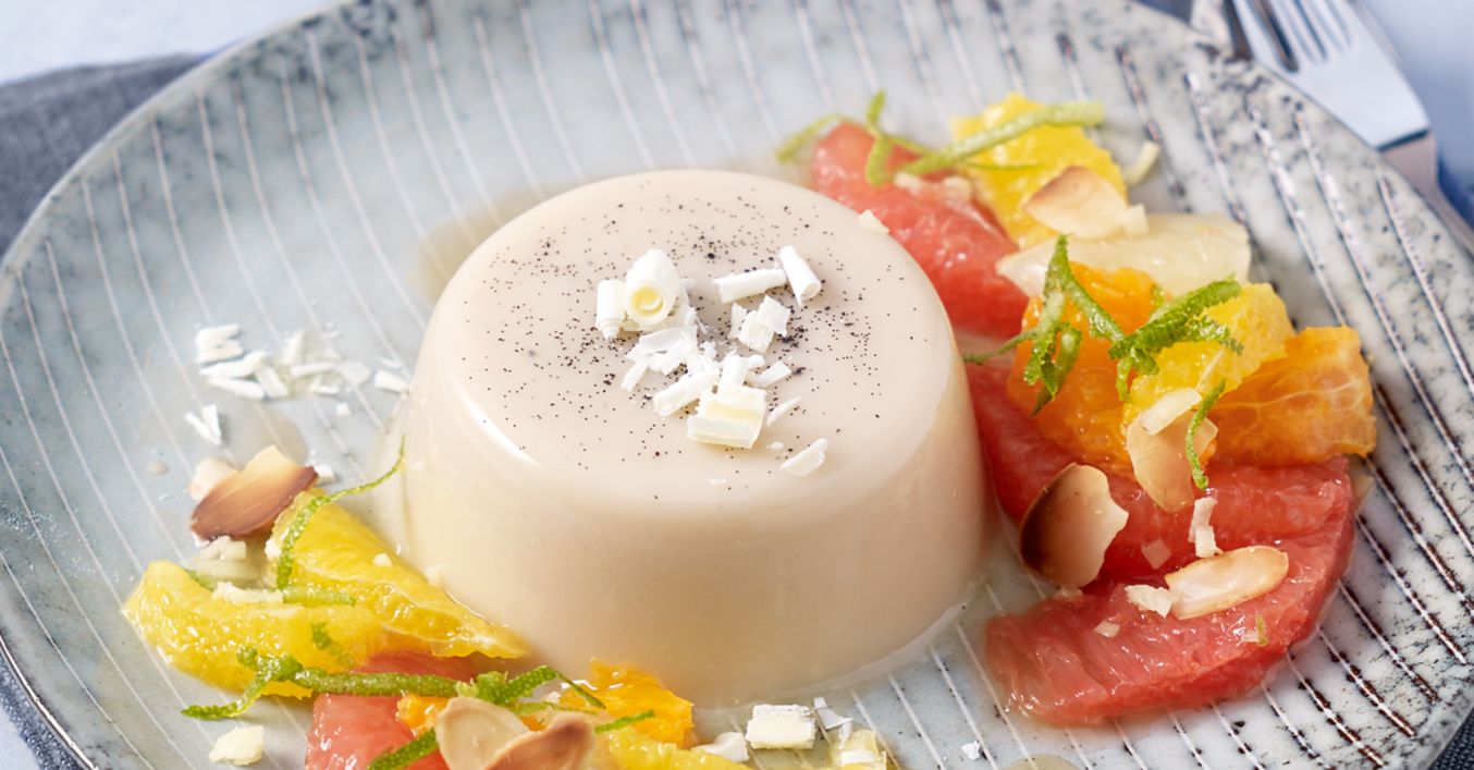 Fulgii de migdale se rumenesc într-o tigaie antiaderentă. Panna cotta de migdale se așază cu salată de citrice și se servește ornată cu fulgi de migdale.