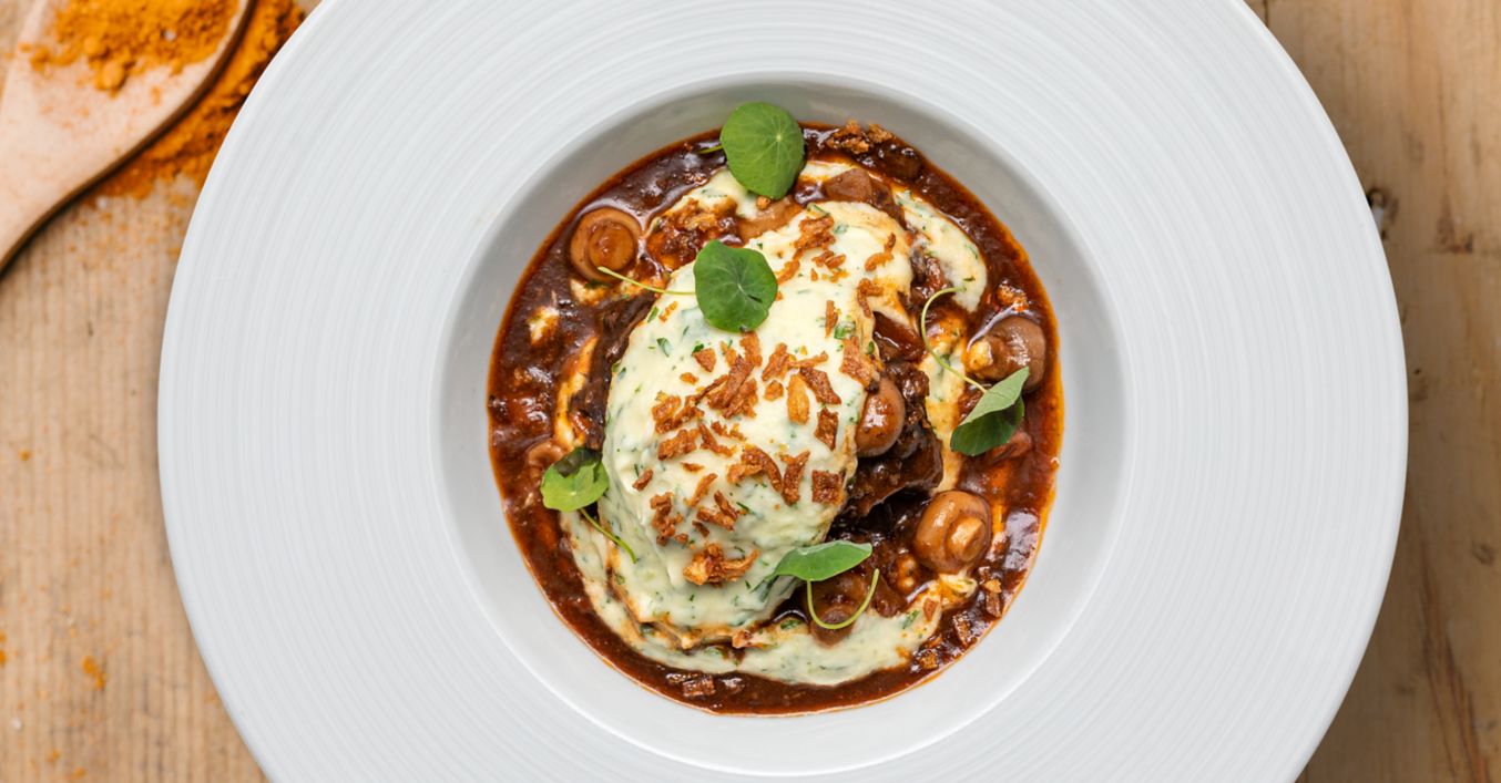 Pe o farfurie punem un strat de piure pe care îl netezim cu o lingură, adăugăm carnea și câteva linguri de sos cu ciuperci, apoi încă o lingură de piure și la final decorăm cu ierburi aromatice.