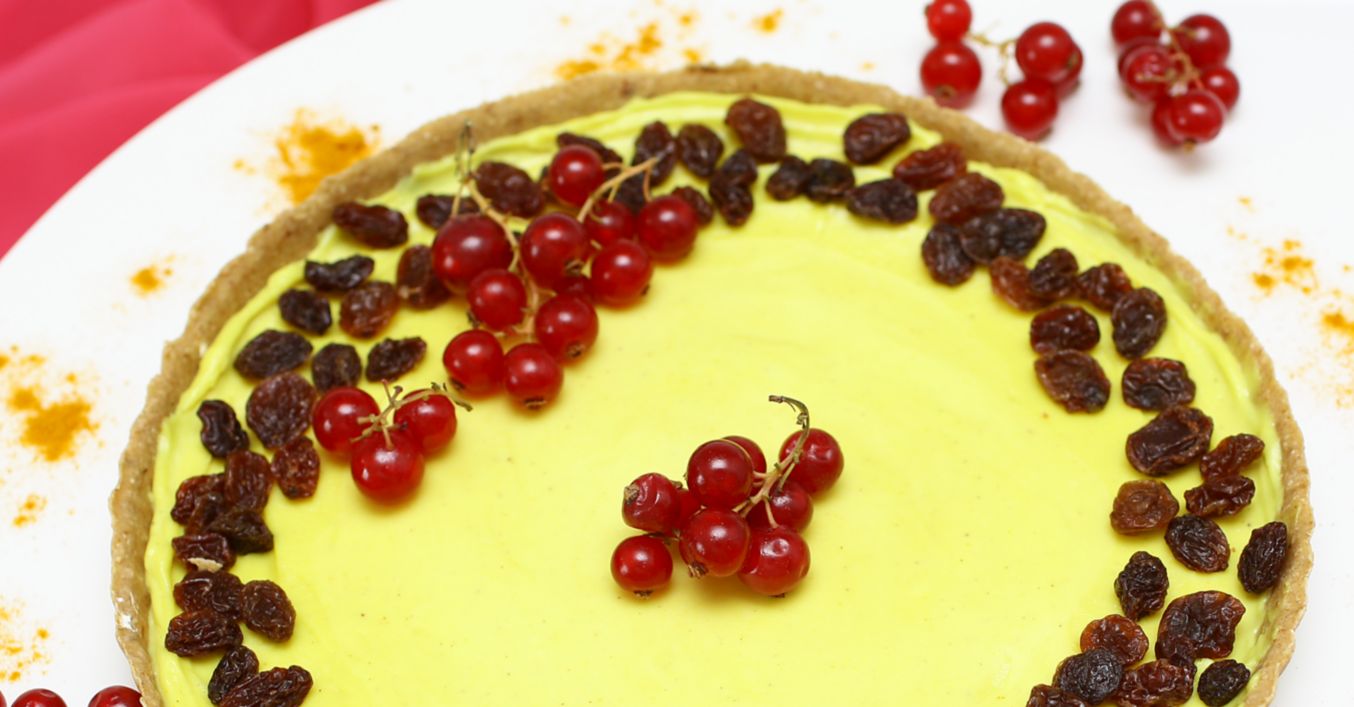 Crema obținută se transferă peste blat și se decorează cu stafide, merișoare și coacăze roșii proaspete.